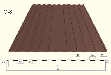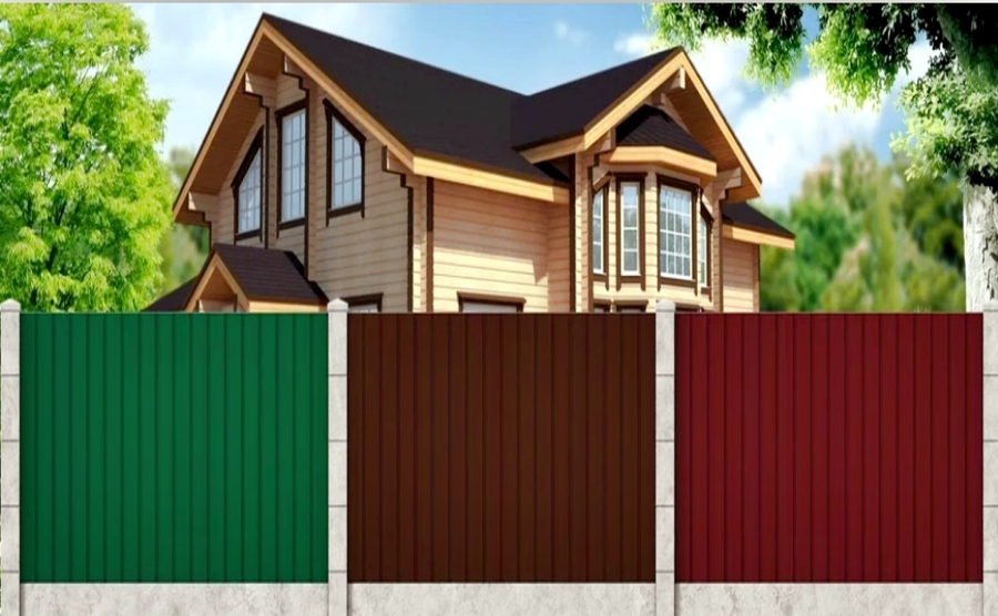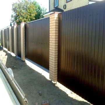 Мы иcпользуем профнастил С-8 0,35-0,7 мм как наиболее подходящий по внешнему виду и для стойкости с учетом крепления на столбы через каждые 2,5 м и по 3 лаги (2 лаги для заборов высотой 1,6 и 1,3 м). Увеличение толщины профиля или изменение гофрирования в данном случае не увеличит прочность забора от внешних погодных воздействий, но повлияют на его стоимость. А сильное физическое или механическое воздействие ен выдержит профнастил ни одной доступной на рынке толщины.