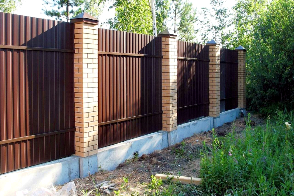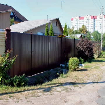 Мы иcпользуем профнастил С-8 0,35-0,7 мм как наиболее подходящий по внешнему виду и для стойкости с учетом крепления на столбы через каждые 2,5 м и по 3 лаги (2 лаги для заборов высотой 1,6 и 1,3 м). Увеличение толщины профиля или изменение гофрирования в данном случае не увеличит прочность забора от внешних погодных воздействий, но повлияют на его стоимость. А сильное физическое или механическое воздействие ен выдержит профнастил ни одной доступной на рынке толщины.